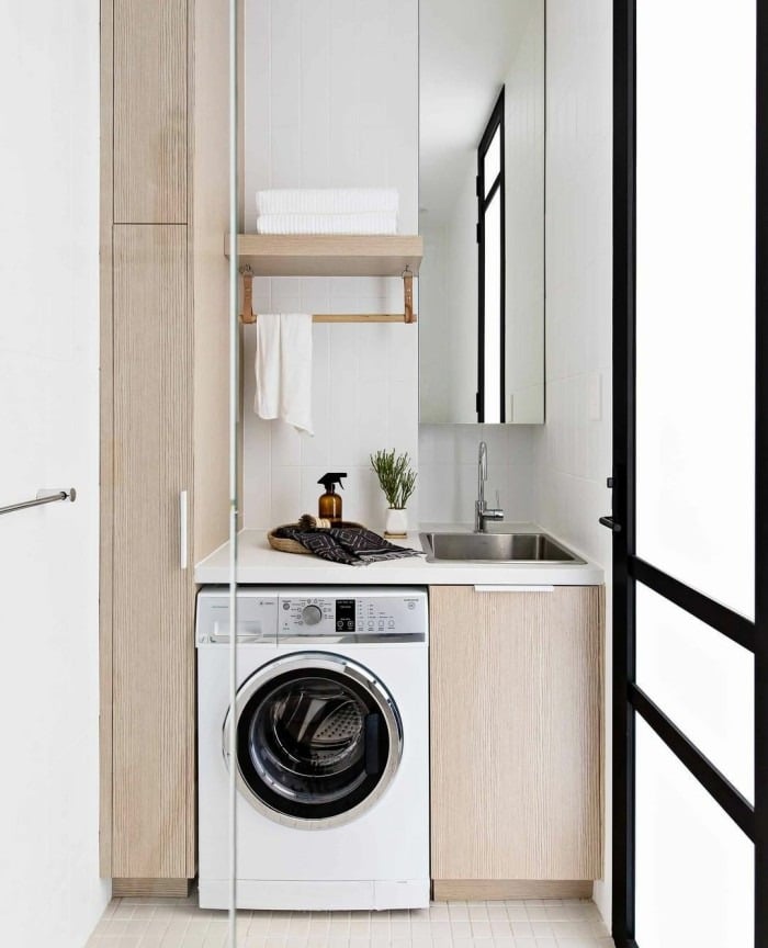 A máquina com função lava e seca é um deles. Moderno e com funções incríveis, o eletrodoméstico elimina a necessidade de um varal. Ao investir na ideia, será possível ganhar mais espaço na lavanderia pequena e aproveitá-lo para outras finalidades, como uma organização inteligente de armários verticais.