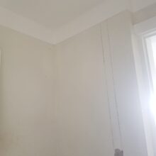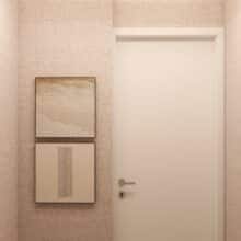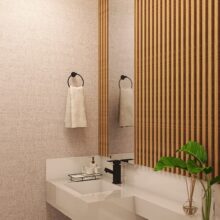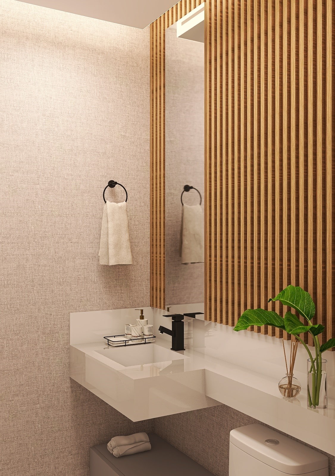 Cliente já tinha algumas preferências, como painel ripado, que já tinha aplicado em outros ambientes, então foi utilizado como destaque decorativo, mantendo a mesma linguagem do restante do imóvel. Para uma sensação de aconchego, foi aplicado papel de parede tipo linho cru, fazendo conexão com o tom do piso da cliente (Superquadra Cru da Portobello), e rebaixo de gesso com iluminação indireta.