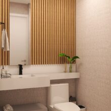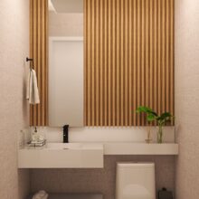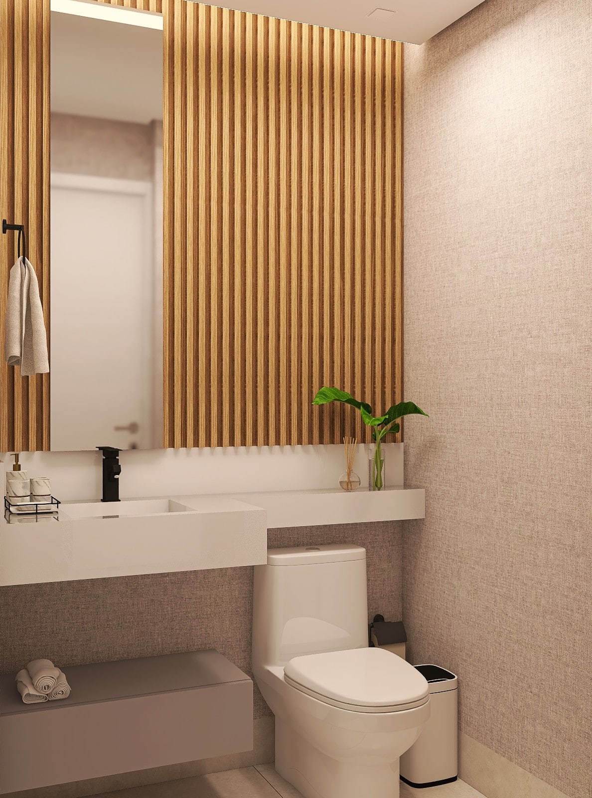 Renovar o ambiente sem quebra-quebra, mantendo itens que cliente já tinha comprado, mas ainda não tinha instalado: bancada com cuba esculpida, piso, bacia sanitária e torneira existentes.