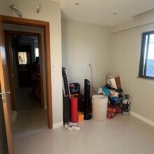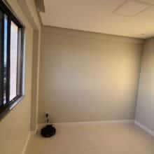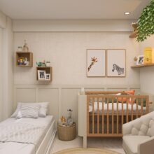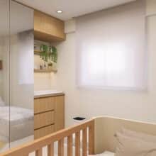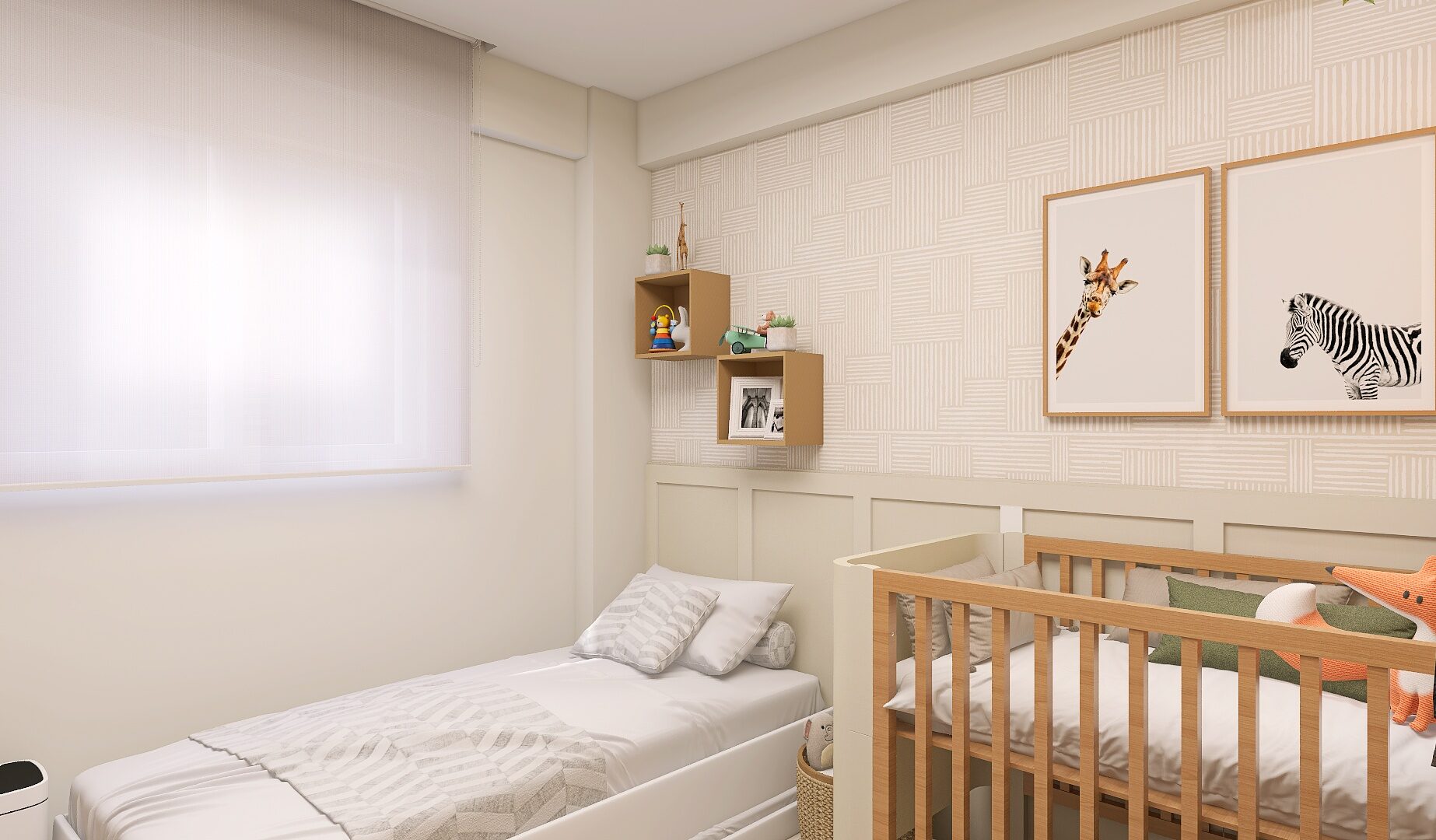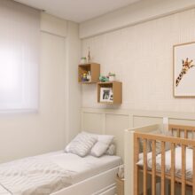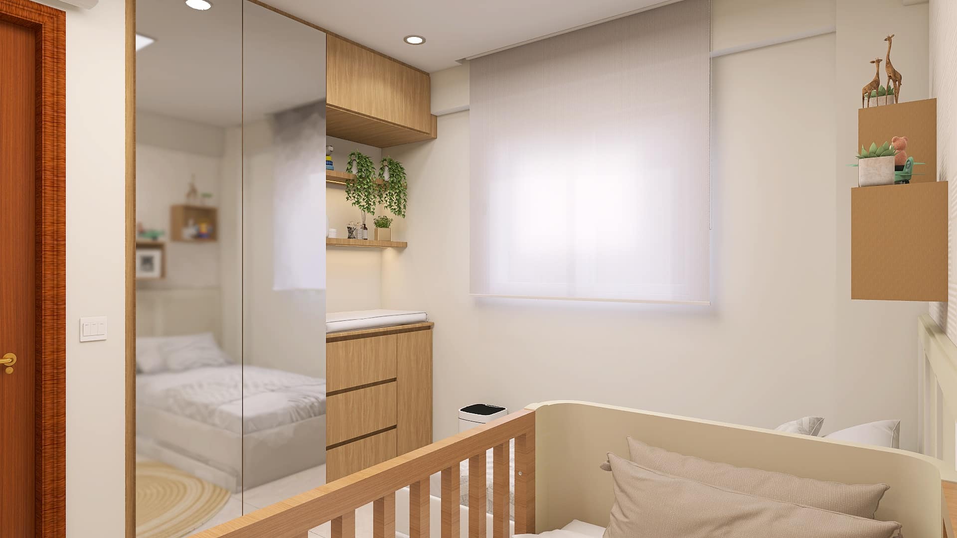 Utilização de tons de madeira e bege na marcenaria, bem como pintura em tom de bege e papel de parede delicado. Desta forma, o ambiente se mantém neutro, e se adapta desde a infância até a fase adulta. A marcenaria contempla roupeiro e cômoda com trocador, futuramente podendo ser utilizada como espaço de armazenamento e decoração.