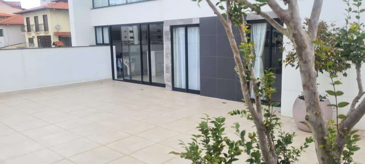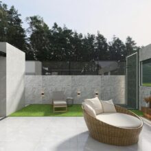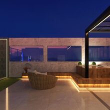 Para aproveitar o ambiente interno e criar integração entre as áreas, a cobertura da área gourmet foi proposta na área onde internamente fica a cozinha, assim os espaços de preparos estão ligados. A cobertura é translúcida para aproveitar ao máximo a iluminação natural ao mesmo tempo que não escurece a cozinha. Já na frente da sala do imóvel está o terraço descoberto, para manter a ventilação total no interior. Nesta área está proposta a parte de descanso, com móveis de área externa confortáveis. Para a inclusão do spa, foi criado um patamar mais alto todo em madeira trazendo a sensação de calma e aconchego. Este terraço está perfeito para curtir cada segundo com a família.