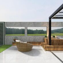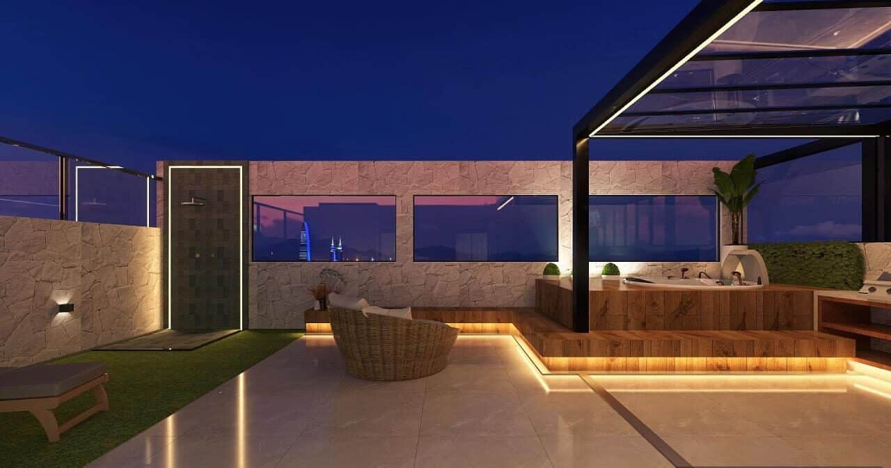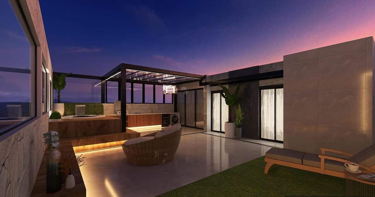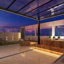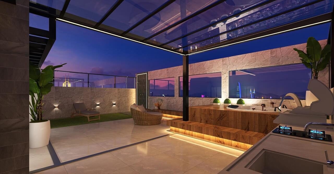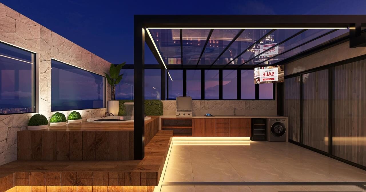 Transformar o terraço vazio em uma área gourmet perfeita para curtir os finais de semana, com churrasqueira, área de descanso e spa. Incluir cobertura e móveis, deixando o terraço totalmente renovado.
