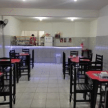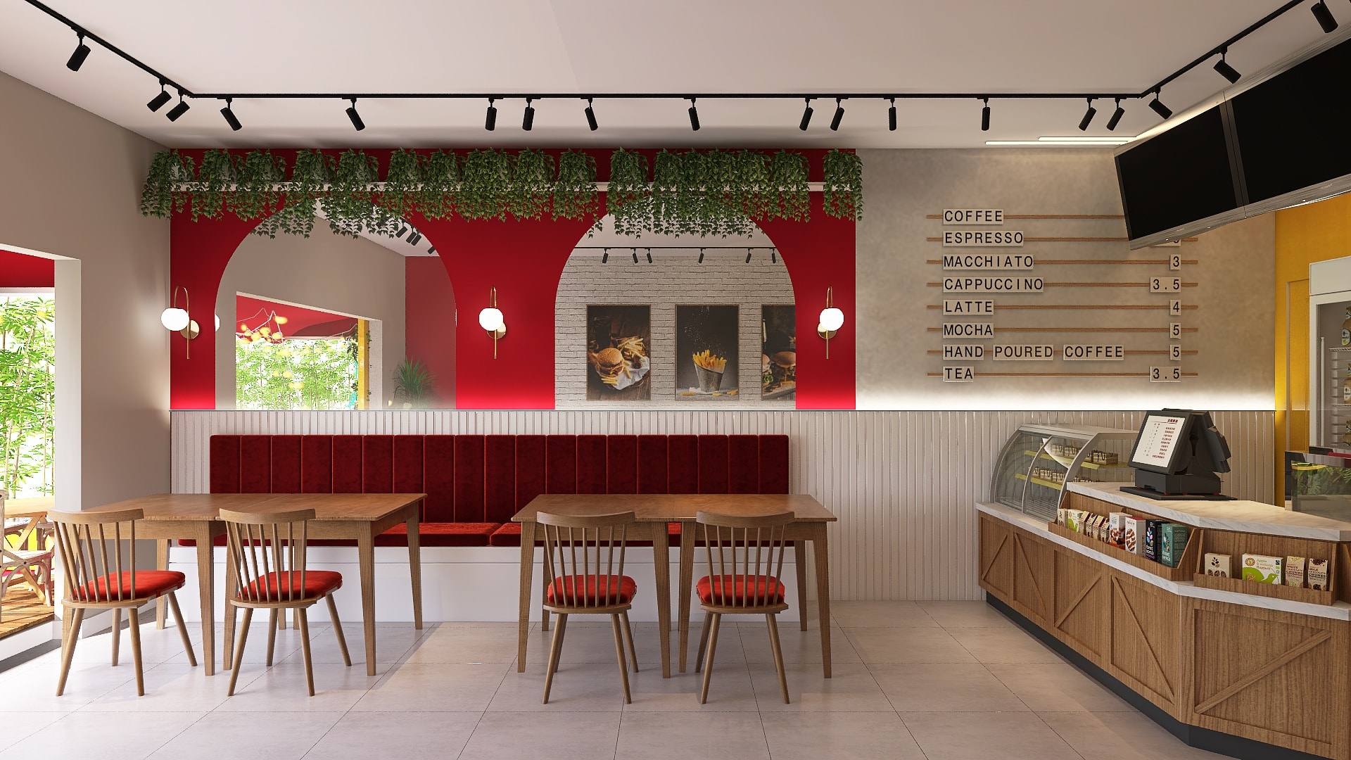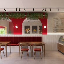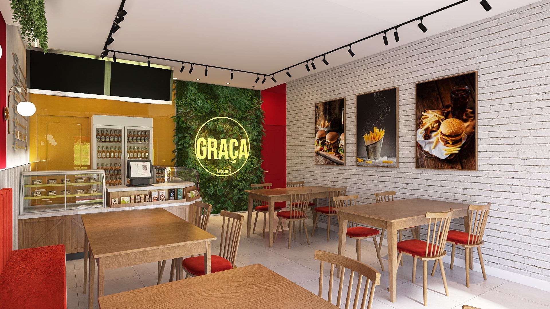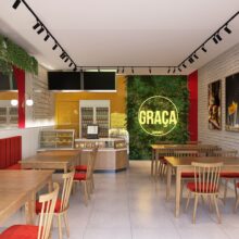 As mesas modulares de 80x80 permitem combinações que acolhem diferentes números de pessoas, assim como o banco estofado na lateral, que permite que mais pessoas sentem próximas. Os tons amadeirados e o jardim vertical deixam o espaço convidativo para os clientes, e o emprego das cores amarelo e vermelho (que remetem a famosas lanchonetes) trazem a identidade do estabelecimento.